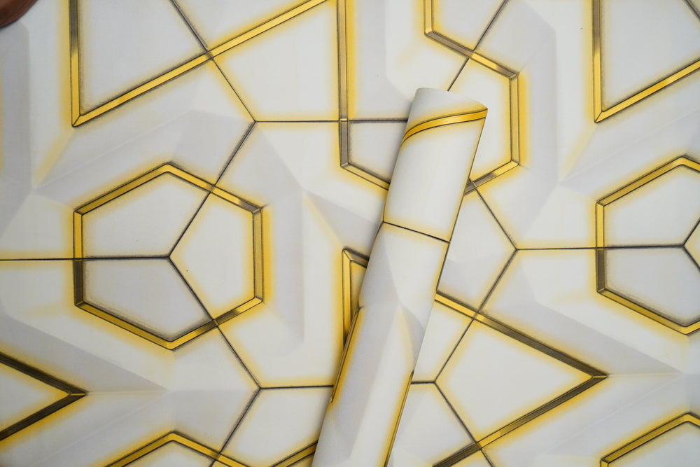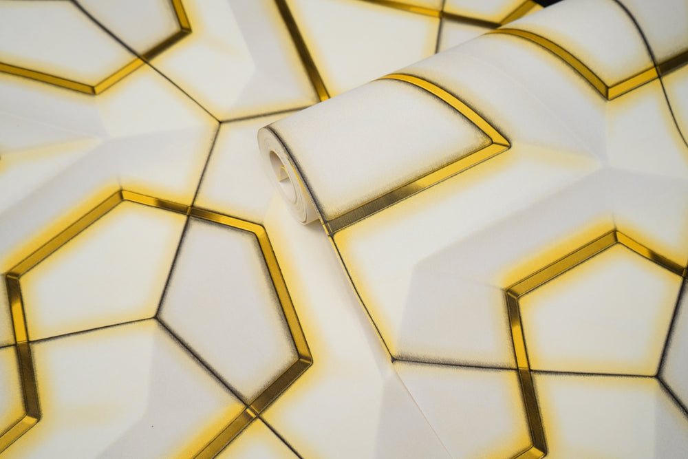 White 3d Geometric Design  with Golden Stripes  Design Not Self Adhesive 53 Cm X 1000 Cm for PVC Vinyl Coated for Wall Bedroom Living Room Latest Stylish for Home Decoration (White & Golden , 57 Sqft Roll) (NW-29)