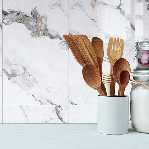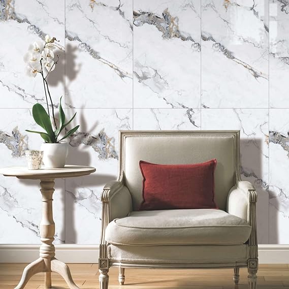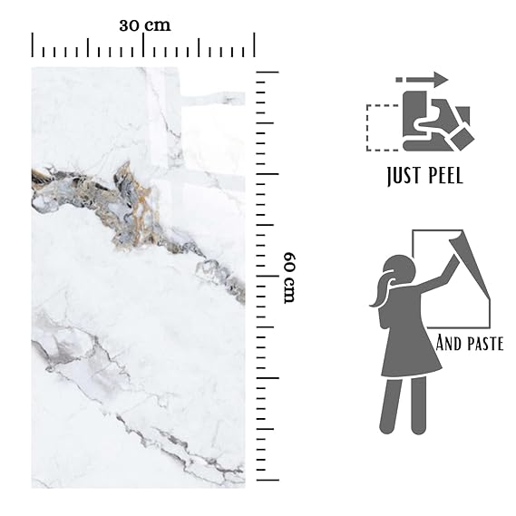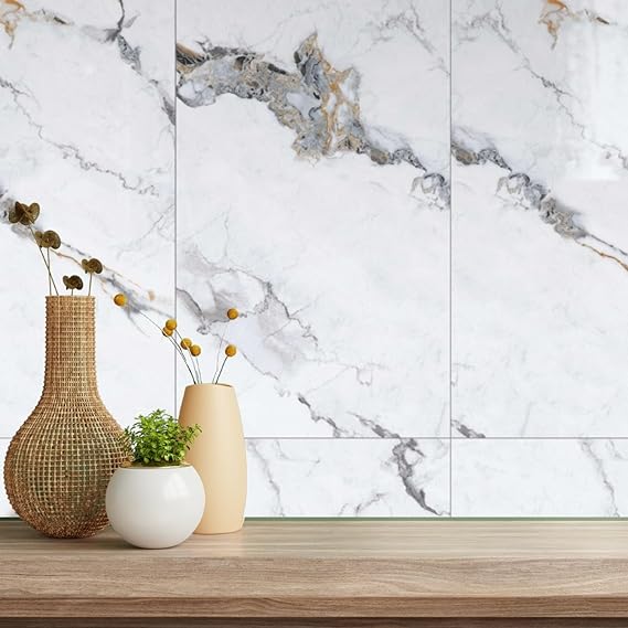 UV Coated White Statuario Marble Sheet, Self Adhesive And Washable Wall Stickers For Wall Decoration ( Set Of 10 )(MS-12)